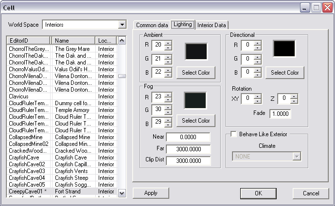Unter diesem Reiter werden wir das Schnellreisen unterbinden und das Musiktyp auf "Dungeon" setzen. Ebenso kannst du hier Wasser ein- und ausschalten, seinen Stand (Z) festlegen und den Wassertyp auswählen. Die "Hand Changed"-Checkbox ist nützlich für Exterior-Zellen, die verändert wurden und nicht von verfahrensorientierter Generierung beeinflusst werden soll.